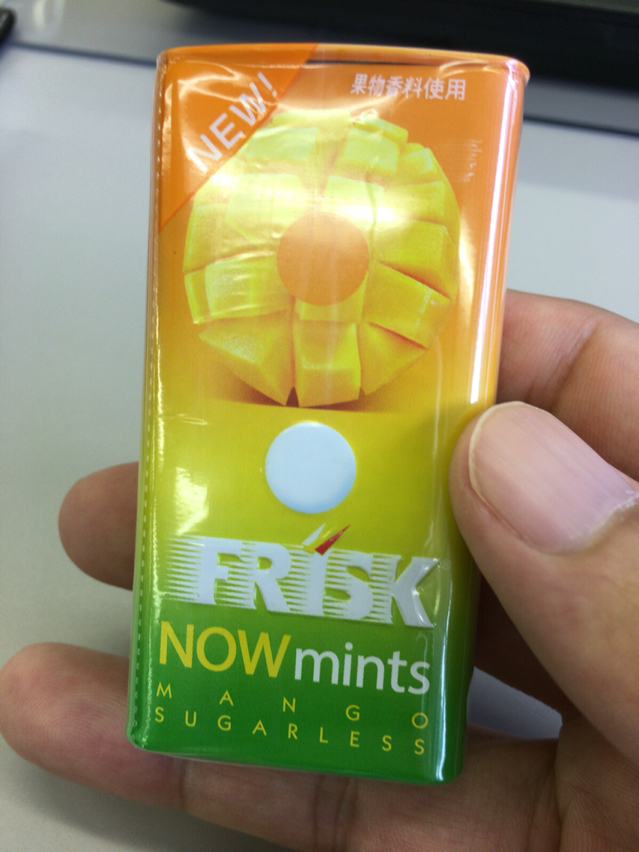 というわけで、先日コンビニでレジ待ちの列に並んでいる時、ふと目に入ったので思わず手に取ってしまったフリスクナウミンツマンゴーを紹介したいと思います。