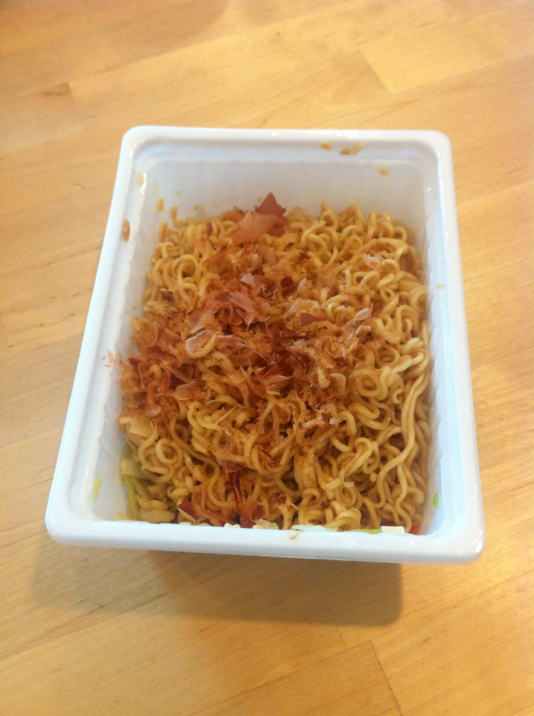 湯切り後にソースを混ぜ合わせて花カツオをかければ出来上がりです。