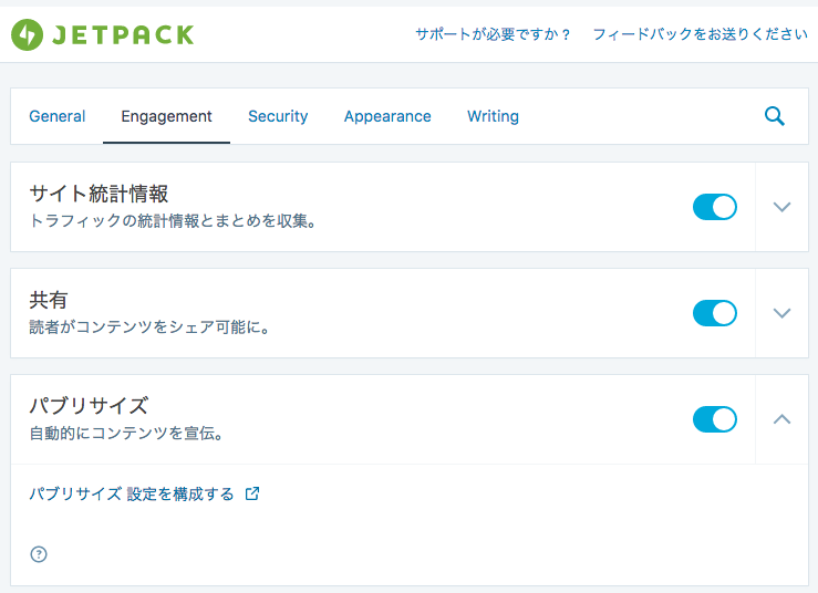 JetPackはWordPress.comの公式プラグインで、様々な拡張機能が利用できる便利なプラグインです。