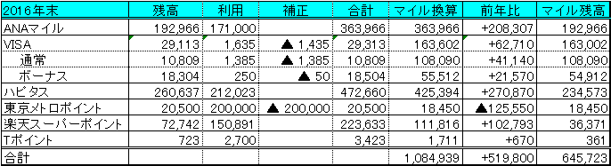 今年の増加マイルを算出するために昨年の獲得マイルもまとめてみました。