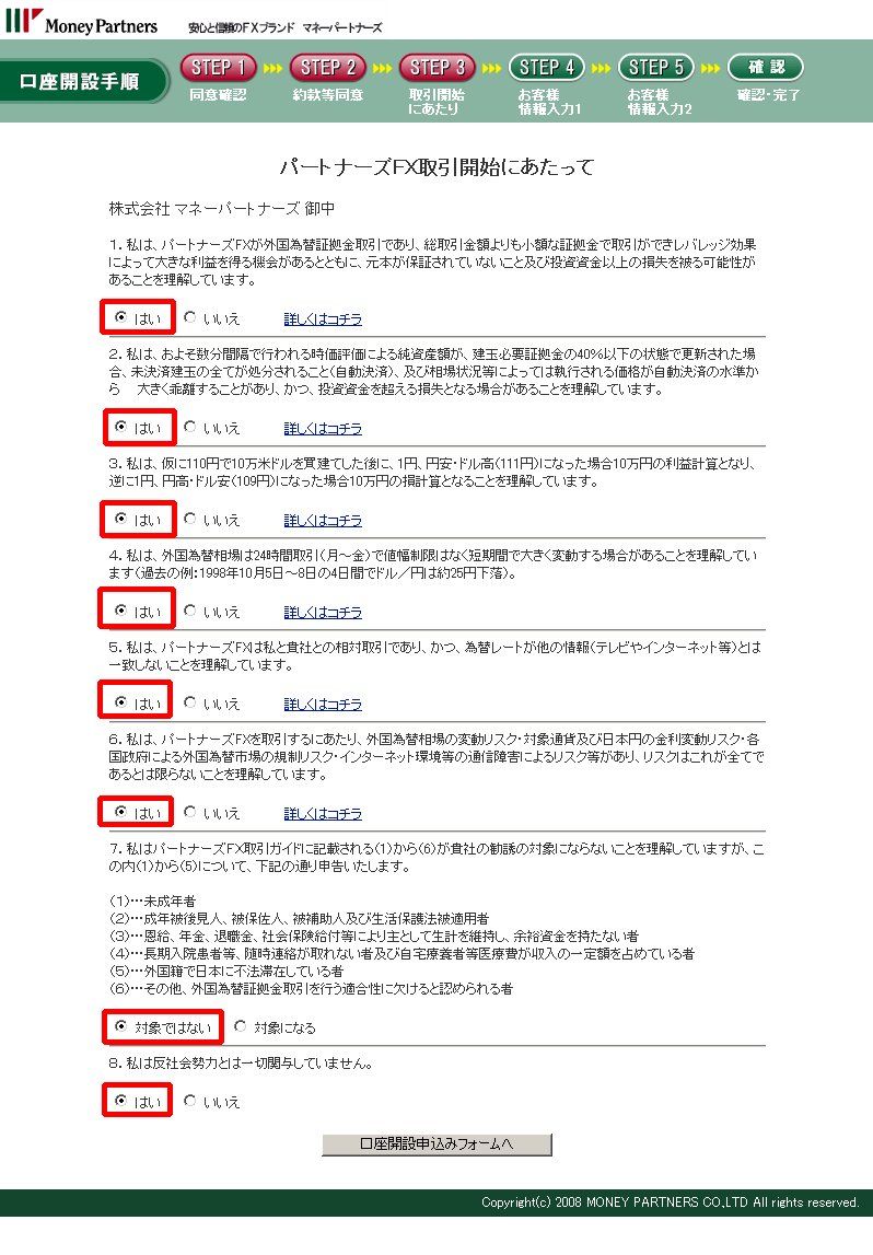 (5)下のような「STEP3 取引開始にあたり」の画面が表示されますので、赤枠部分8箇所にチェックを入れて、一番下の「口座開設申込みフォームへ」をクリックします。