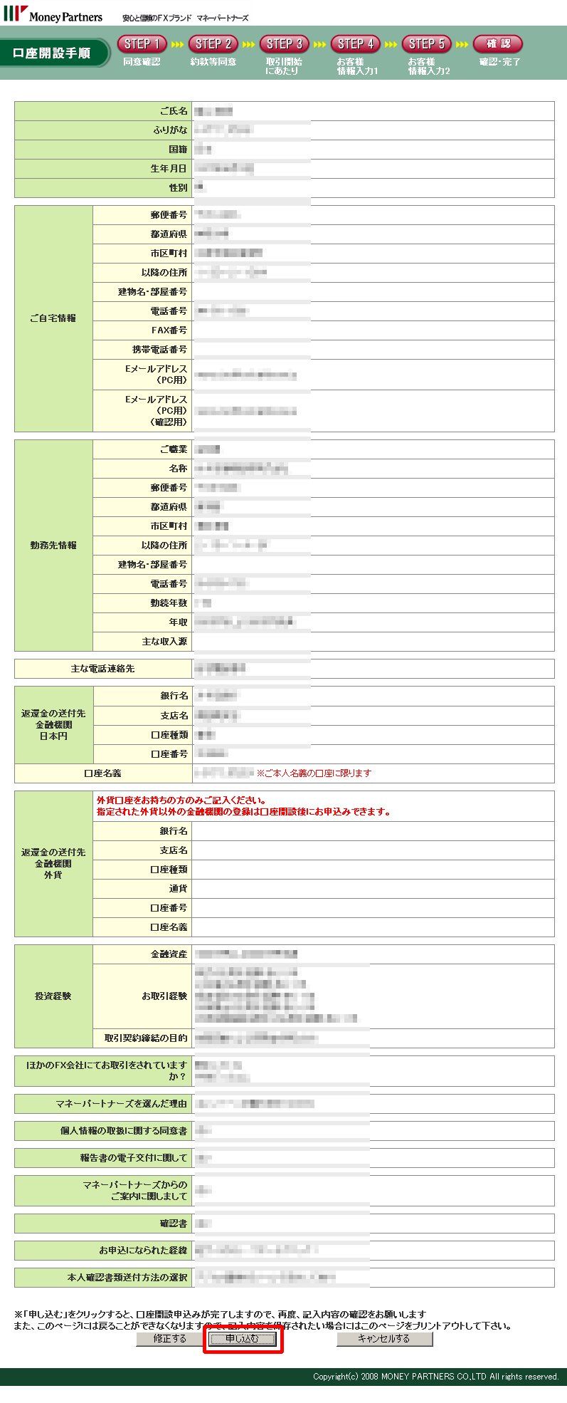 (7)下のような「STEP5 お客様情報入力2」の画面が表示されますので、赤枠部分を入力して、一番下の「確認画面」をクリックします。