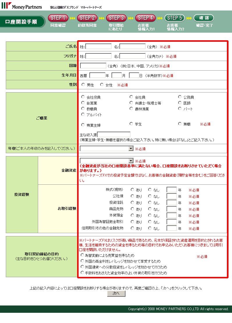 (6)下のような「STEP4 お客様情報入力1」の画面が表示されますので、赤枠部分を入力して、一番下の「次へ」をクリックします。