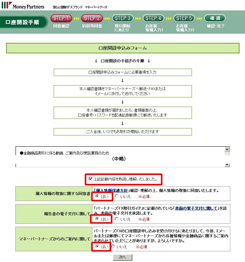 なお、「マネーパートナーズからのご案内に関して」という項目で、「いいえ」を選択することはできませんので、ここでは必ず「はい」にチェックを入れることになります。