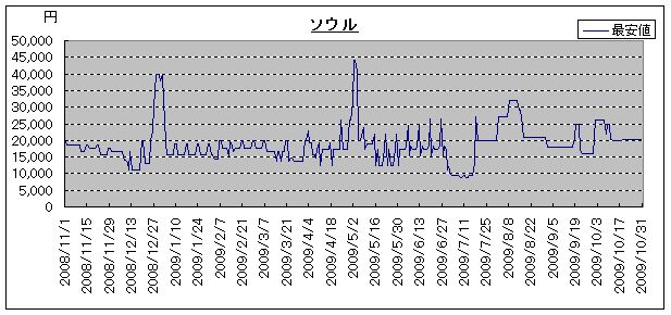 格安航空券の底値推移(2009年10月調査・ソウル)